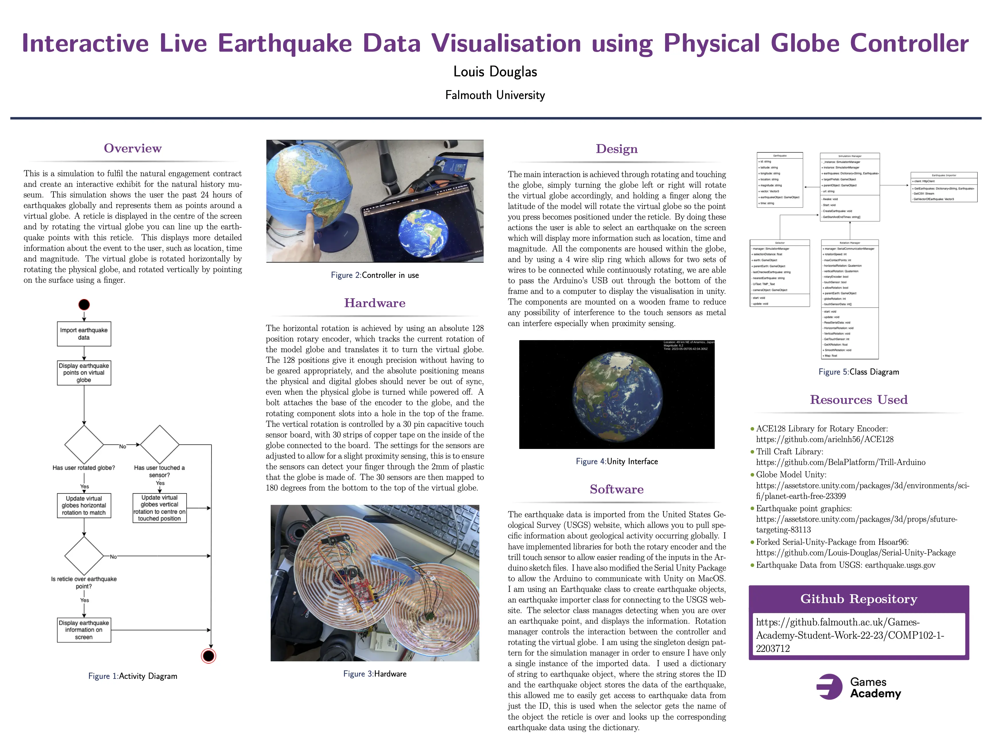 The system integrates a 128-position rotary encoder and a 30-pin capacitive touch sensor, allowing users to align earthquake points with an on-screen reticle to view details such as location, time, and magnitude. Inside the globe, an Arduino communicates over USB via a 4-wire slip ring with a Unity-based visualisation running externally, while live data from the US Geological Survey is used for displaying these earthquake points.